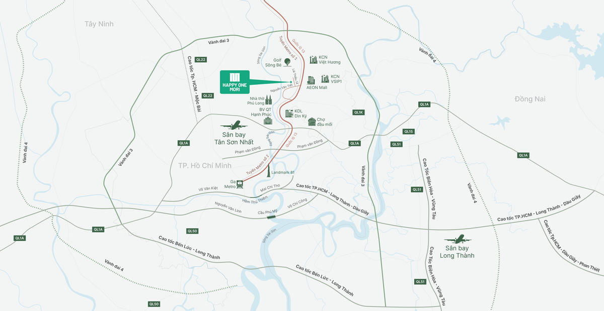 Happy One Mori là dự án khu căn hộ compound hạng sang, hiếm hoi sở hữu đến 3 mặt giáp sông tại trung tâm mới của TP HCM. Với vị trí đắc địa ngay mặt tiền đường song hành cao tốc TP HCM – Long Thành, cách nút giao An Phú chỉ 1km, dự án thuận tiện kết nối đến tất cả các khu vực của TP HCM mở rộng và sân bay Long Thành.